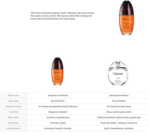 BENEFITS: OBSESSION has a feverish intensity and an irresistible appeal. SUGGESTED USE: Apply to skin, spraying 3-6 inches away from surface. DESCRIPTION: Passionate. Powerful. Intense. Between love and madness lies OBSESSION. 100% Authentic - BRAND NEW SEAL IN A BOX. Eau de Toilette or Eau de Parfum? The difference lies in the volume of perfume oil. While Eau de Toilette contains 5-9%, Eau de Parfum contains more, usually 8-14%. Eau de Parfums therefore last longer and smell more intense.