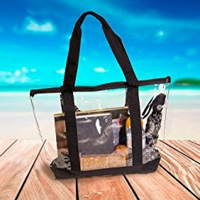 Clear Stadium Security Travel & Gym Zippered Tote Bag By Bags For Less – Sturdy PVC Construction, Black Trim, Full Zipper Top Gusset – Clear Front Pocket – Color Fabric Bottom & Long Handles