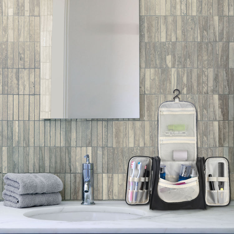 • CONVENIENT COMPARTMENTS: The toiletry kit features multiple compartments in various sizes to accommodate all your everyday essentials. The kit's large main compartment keeps items easily viewable and well-sorted thanks to its mesh divider and internal storage spaces--perfect for both smaller and larger items alike. Two, external, zippered side compartments offer added space with an internal lining, which makes them a great choice for storing liquids, gels, or other products that could leak.