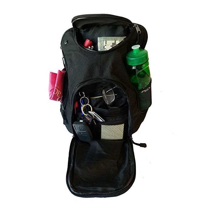 • Fits most 16-inch laptops; separate padded laptop compartment with zippered side entry for easy access. Internal cell phone pouch with headphone port: water bottle pouches: removable key ring.