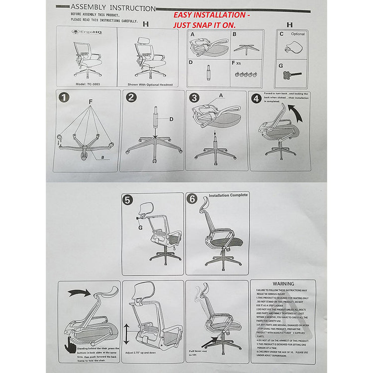 *Ergonomic Design Office Chair: High back with or without headrest ,SEAT SLIDER CHAIR - adjustment for different person's height, adjustment lumbar support and seat height,360-degree swivel,gives extra relaxation and comfortable for long day work people. Heavy duty nylon base and smooth-rolling casters with weight capacity of 250 poundsEasy to Install: The instructions are very easy to follow, you just need to count a few screws and bolts, you can assemble it