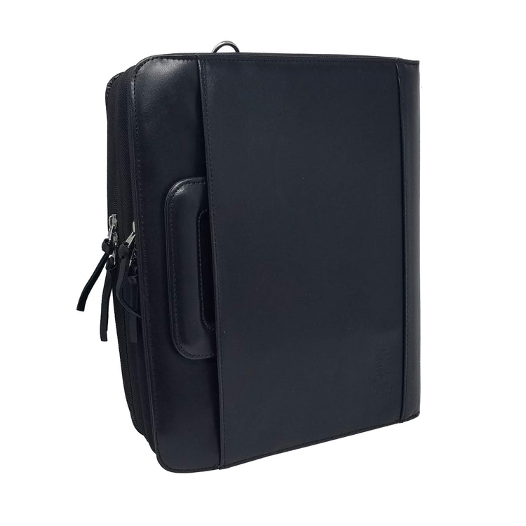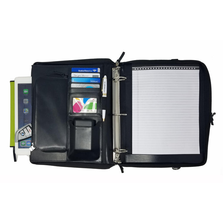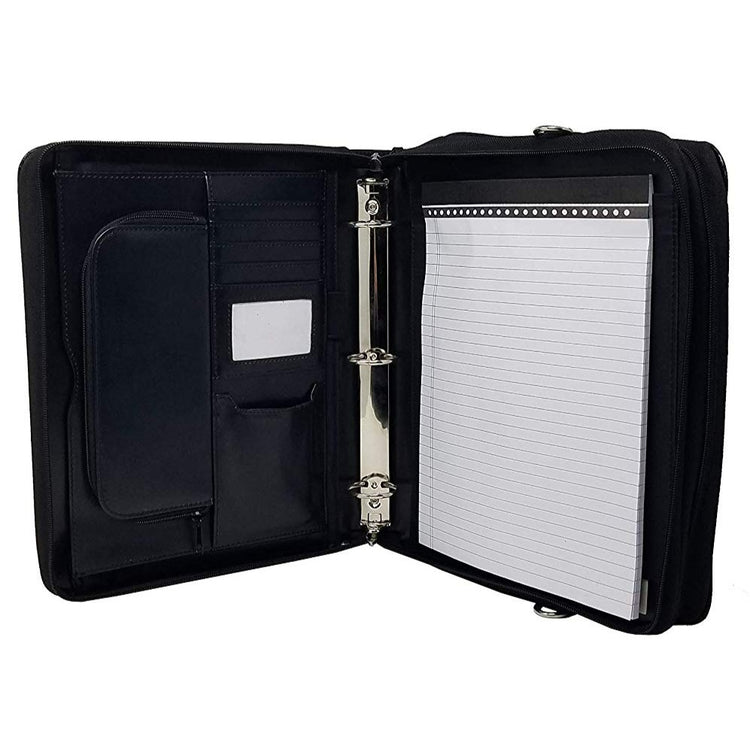 Impecgear PU Leather Professional Portfolio Padfolio Travel Briefcase Organizer W/iPad Mini Tablet Sleeve Holder, File Dividers W/Notepad 3-Ring Binder W/ Smart Handle & Strap-Double Zippered Closure (Free Pen) (Black - PU Leather - DC3062)