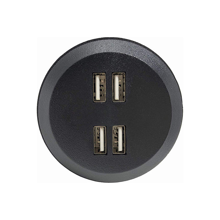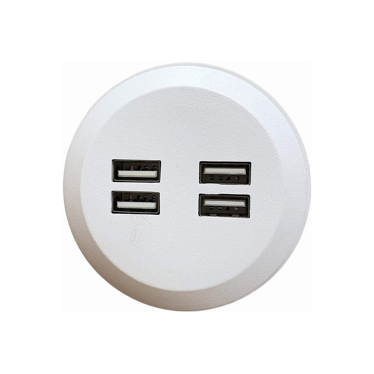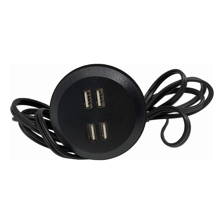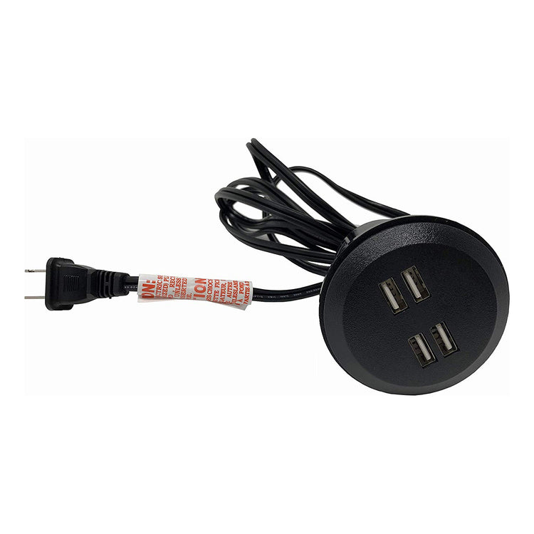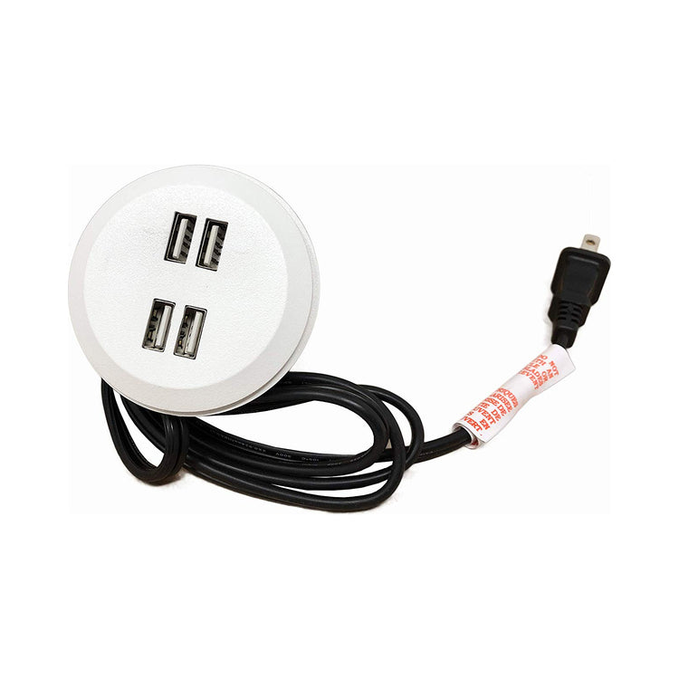 FEATURE: 2" round socket with 4 USB port. 5V 4.2A total charging.......6.5 feet wire cord. FITS any hole that is 2" to 2.5" - just snap this onto the hole and lock it on the bottom with the ring. Most office tables come with the 2" hole now, if not, just drill one yourself.