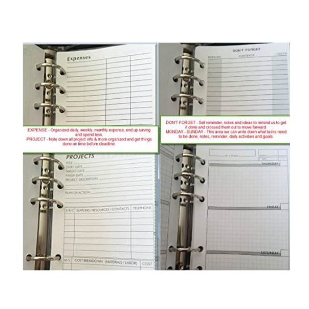 • *FEATURES: 2 clear Plastic Inner Sleeves (Business Cards, Accessories), 6 Inch Ruler (Planner Book - Weekly Planning tab, Things To Do tab, Project tab, Expenses tab, Notes tab, Address Book) Notepad (20 pgs). Pockets: 4 inside, 2 side zip (one each side) BUY PACK OF 4 - SAVE ANOTHER 35% (PEN NOT INCLUDED)