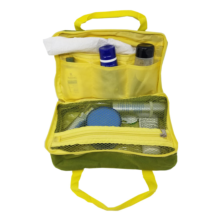 Cosmetic Bag - Lime Green/Yellow 600D Polyester 10'X 7"x 5" Front zippered pocket, larger zippered main compartment open into 2 organizers: 1 full-size zippered mesh compartment for toiletries and 1 zippered compartment w/3 accessory pockets, easy carry handle.