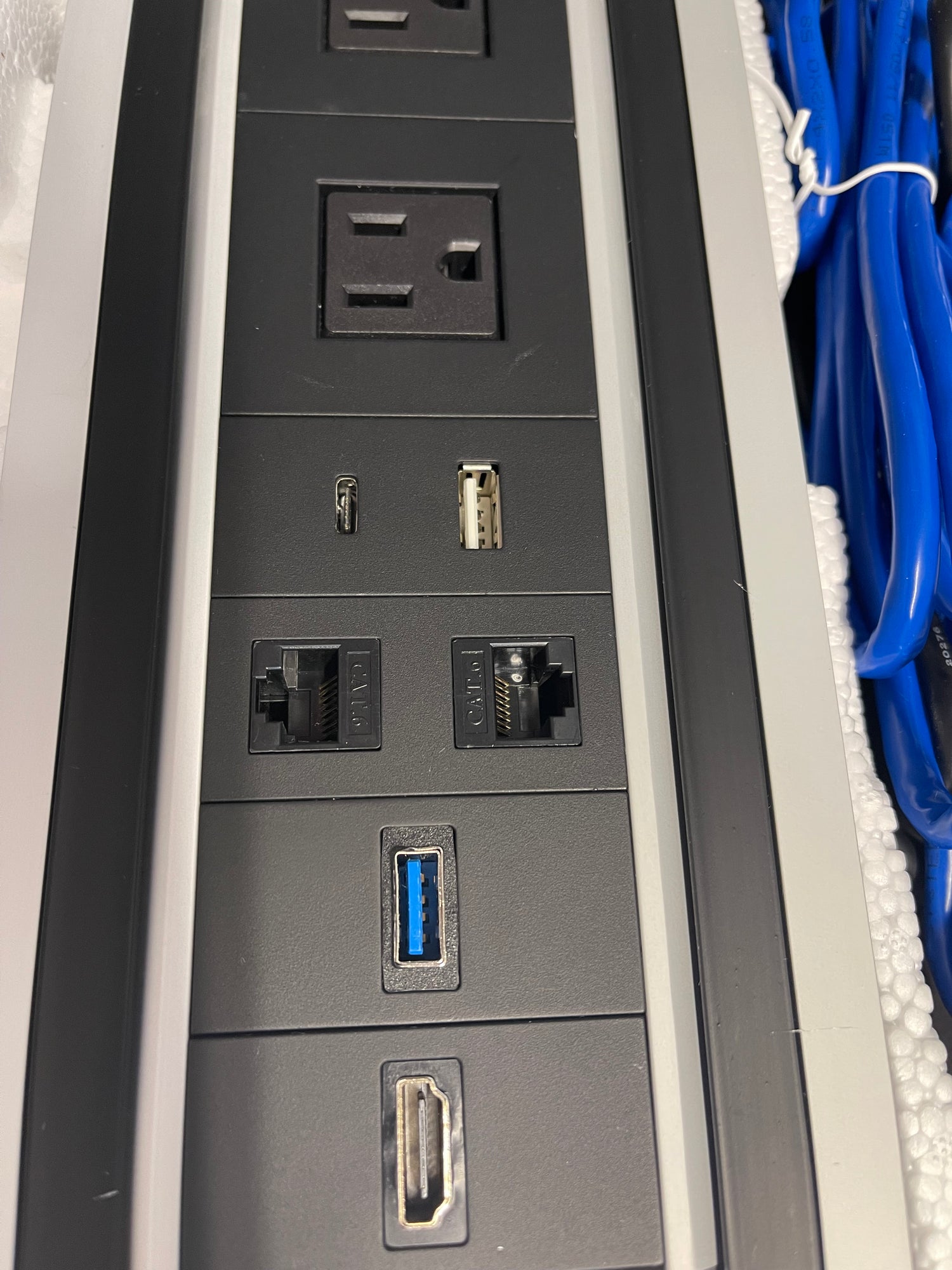 • 2 X AC PLUG, 1XUSB & 1X USB TYPE-C FAST CHARGING PORT, 1X HDMI, 1X PASS THRU, 1X CAT6- 6 feet power cable line....1X HDMI PORT, 1X USB - 1X FAST TYPE-C, 2X DATA (CAT 6), 1X USB 3.0 PASSTHRU ...... Rating: 110 VOLT, 10 AMP, 1100 WATTS RATED LOAD....Flush-Mount 180" Rotation.....WEIGHT: 3.7 LBS.
